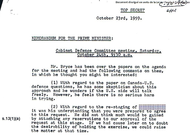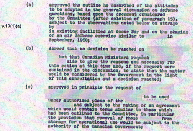 In section (a) it is clear that someone is asking the Government of Canada to store something at Goose Bay, and also that the Cabinet is considering an upcoming September 1960 air defence exercise similar to something else – possibly the name of a previous exercise. Section (c) clearly relates to the storage issue – the storage of something that could be used “under authorized plans” and that that something, whatever it is, had an “operational use.”