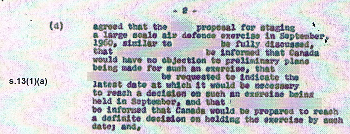 Let’s start with the air defence exercises. With just a modicum of Googling, you’ll find that Canada and the United States planned to hold an exercise called “Skyshield” in September 1960 – in fact, the series of Skyshield exercises have their own Wikipedia page. A bit more Googling for “air defence exercise” brings up Andrew Richter’s Avoiding Armageddon: Canadian Military Strategy and Nuclear Weapons, 1950-1963 (UBC Press, 2011), and reveals that the earlier name for such exercises was “Sky Hawk.” Don’t forget – the analyst deciding if that information should be released already knows the names of the exercises. (As an aside, note that both Skyhawk and Skyshield were plans for joint exercises, and so I think Section 13 is really inapplicable. Joint plans are not “obtained in confidence” from another government, or they wouldn’t be “joint” at all; they’re just as much Government of Canada information as American information.)