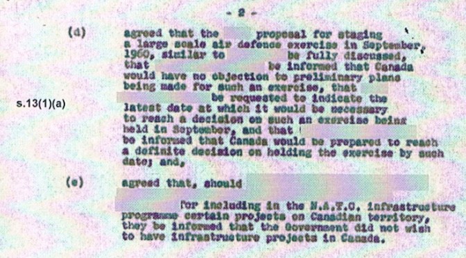 Despite myriad problems with the Access to Information Act and the stalled and frustrating process of its renewal, the Act works very well for historians seeking access to documents held at LAC. That said, every once and a while, a release package arrives that suggests something broken in the declassification process. What I describe below is timely, relating to an article Asa McKercher and I have just published in The Historical Journal, “Skyhawk, Skyshield, and the Soviets: Revisiting Canada’s Cold War.”(in First View online, at the moment). The article explores a particular episode of Canadian history: Canada-United States air defence exercises in the Cold War. By coincidence – painful coincidence – I received an ATIP release package that shows the continued classification of basic information from our article that we had found in archives in Canada, the United States, and online.