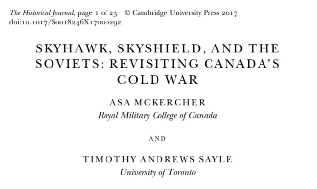 In fact, the Government of Canada – or at least other parts of it – have not considered these to be secrets worth keeping. John Hilliker and Donald Barry discuss “Skyhawk” in Canada’s Department of External Affairs, Volume 2: Coming of Age, 1946-1968 (McGill-Queen’s Press, 1995). What’s more, the Government of Canada itself published several documents related to later iterations of Skyshield in its Documents on Canadian External Relations (see here). The most intrepid analyst might have found Asa McKercher’s new Camelot and Canada: Canadian-American Relations in the Kennedy Era (Oxford: 2016), and discovered that the footnotes available online show the document titles and archival locations of publicly available records on BOTH Skyhawk and Skyshield. Some of them are even in Ottawa.
