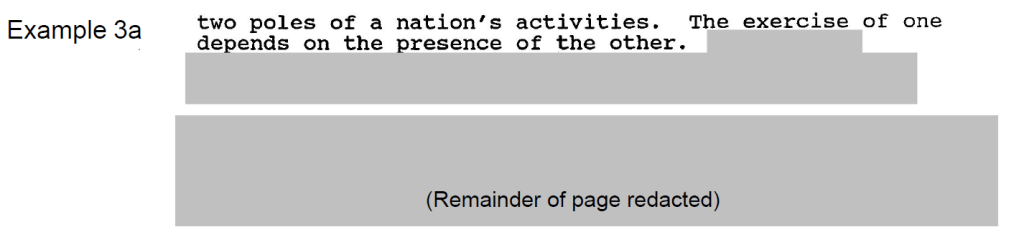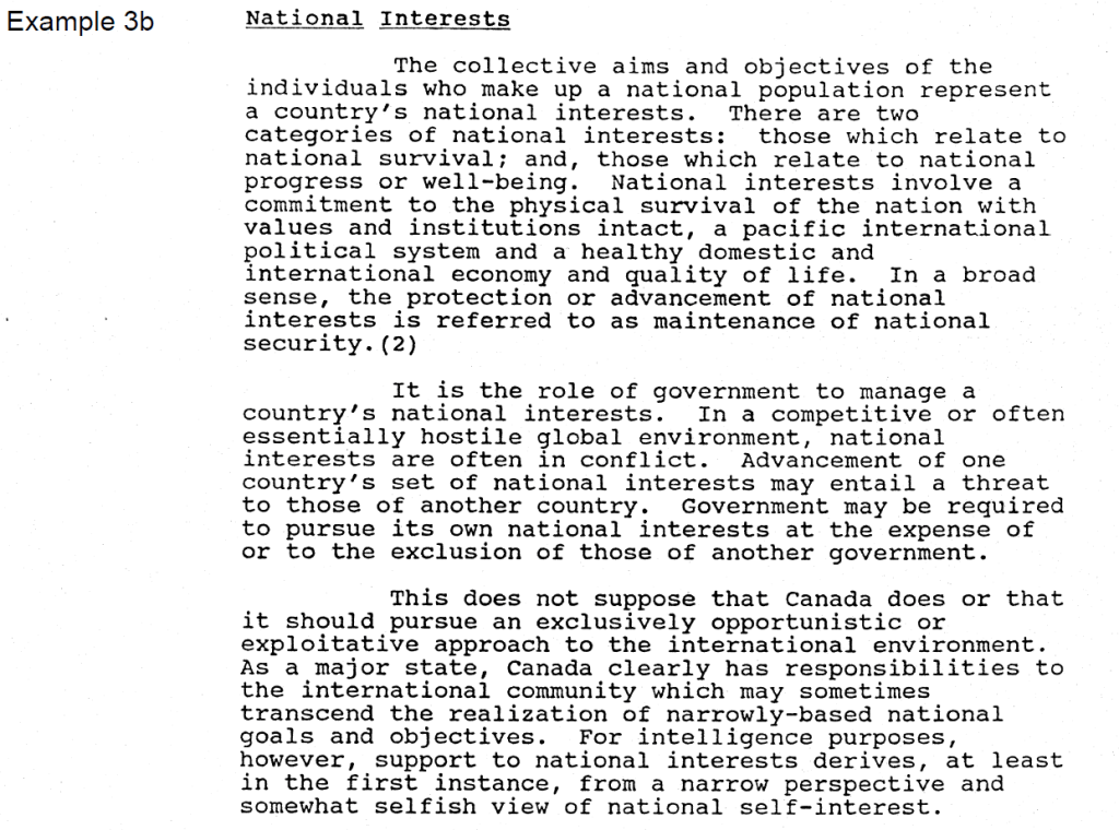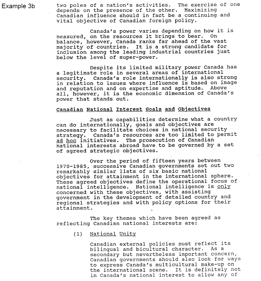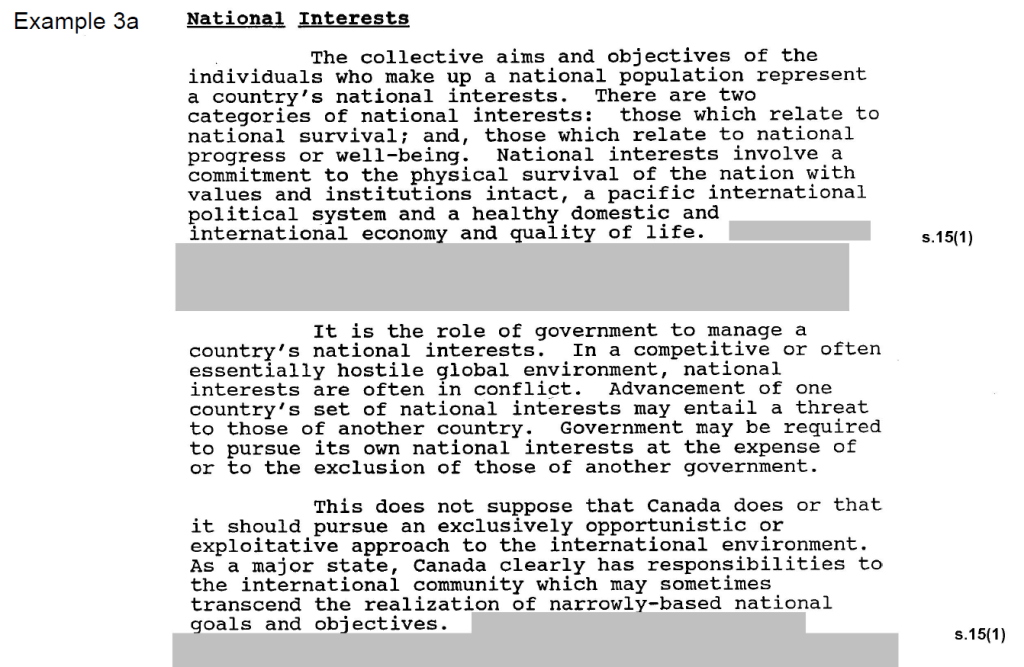 The redacted sections in Example 3a describe in the most general and anodyne terms Canadian foreign policy objectives—objectives that were publicly described in many government publications of the time. The reviewers appear to have applied a rule of thumb to “redact any mention of Canadian policy.” However, this was done without any consideration of the context of the information and without a proper application of the required harm test.