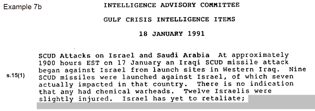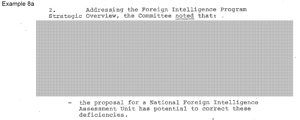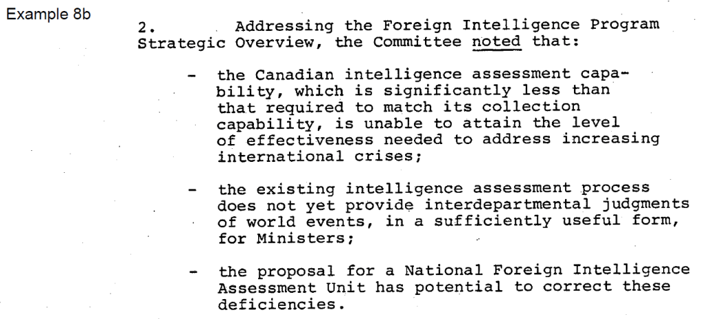 The redacted section in Example 8a notes deficiencies in Canada’s strategic intelligence assessment capabilities at the time. This says nothing about Canada’s current assessment capabilities, since presumably there have been plenty of opportunities to rectify these deficiencies in the intervening 40 years. By invoking Section 15, the department is asserting that the release of this information would harm Canadian international affairs, but this claim does not seem to be justified. Rather, it appears that the department is seeking to withhold information that would reflect poorly on the intelligence community.