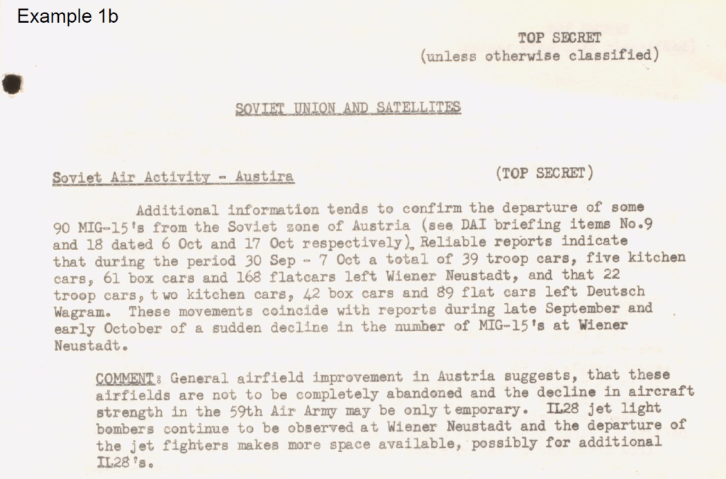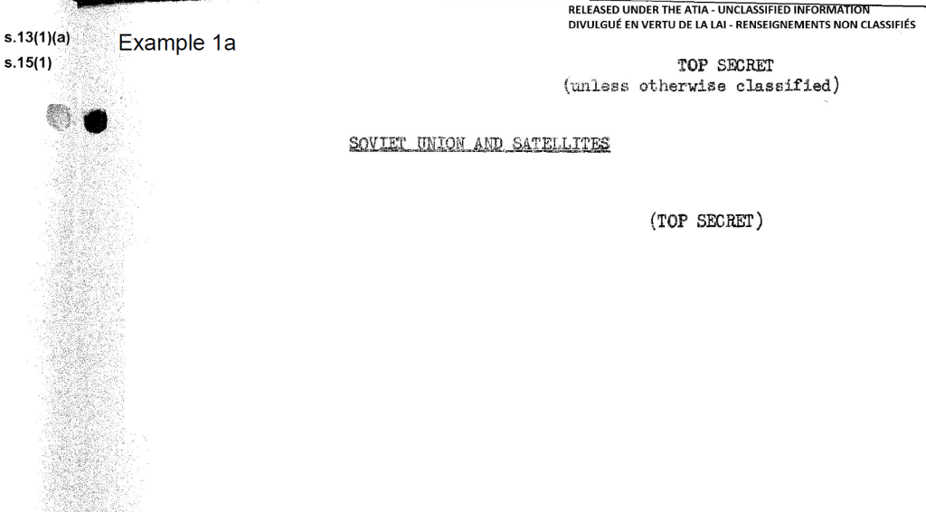 The redactions in Example 1a did not meet the harm test required by Section 15: there can be no reasonable expectation that releasing this information on Soviet air force activities in Austria or Soviet interest in Afghanistan almost 70 years ago would negatively affect Canadian international affairs or defence. The information has been available in DND open archives for a number of years with no harm to Canadian interests. Further, there is no indication that this information came from a foreign government in confidence, the requirement for redactions under Section 13.