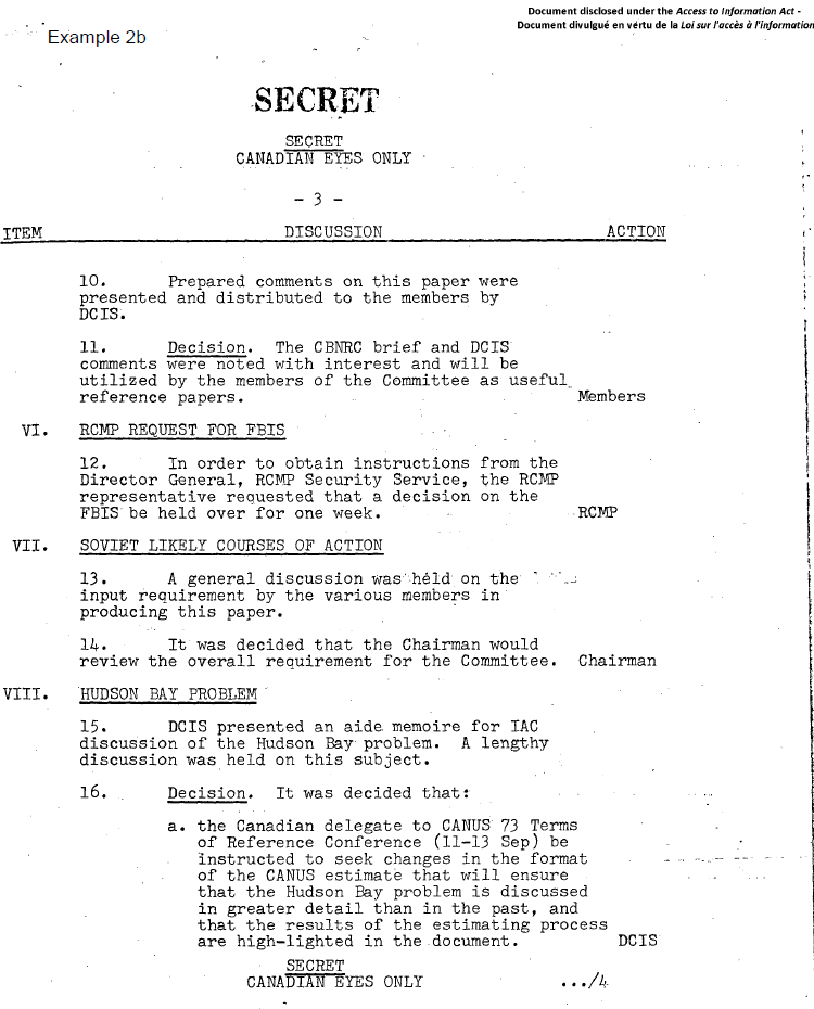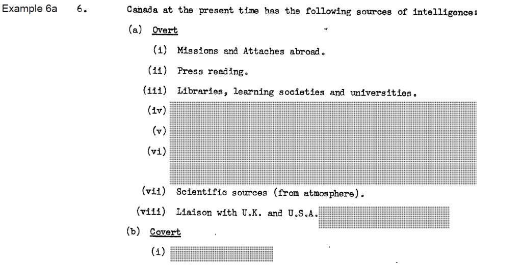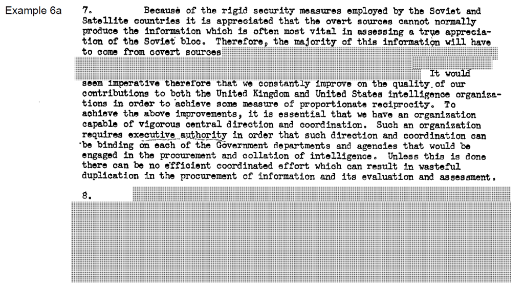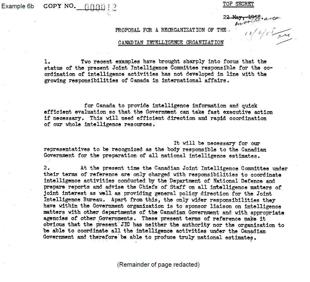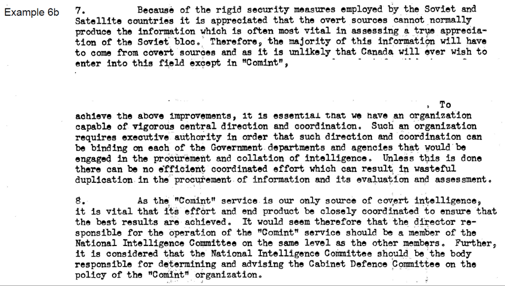 The redactions to Example 6a largely involve removing mention—no matter how cursory—of certain sources of information, particularly references to “COMINT” (communications intelligence). However, the reviewers did not take into account the very large quantity of documentation on this subject that has already been made public, including the release by the Communication Security Establishment (CSE) of substantial portions of a classified internal history of its predecessor, the Communications Branch of the National Research Council.