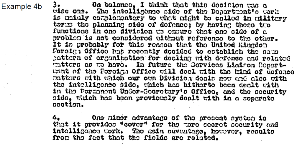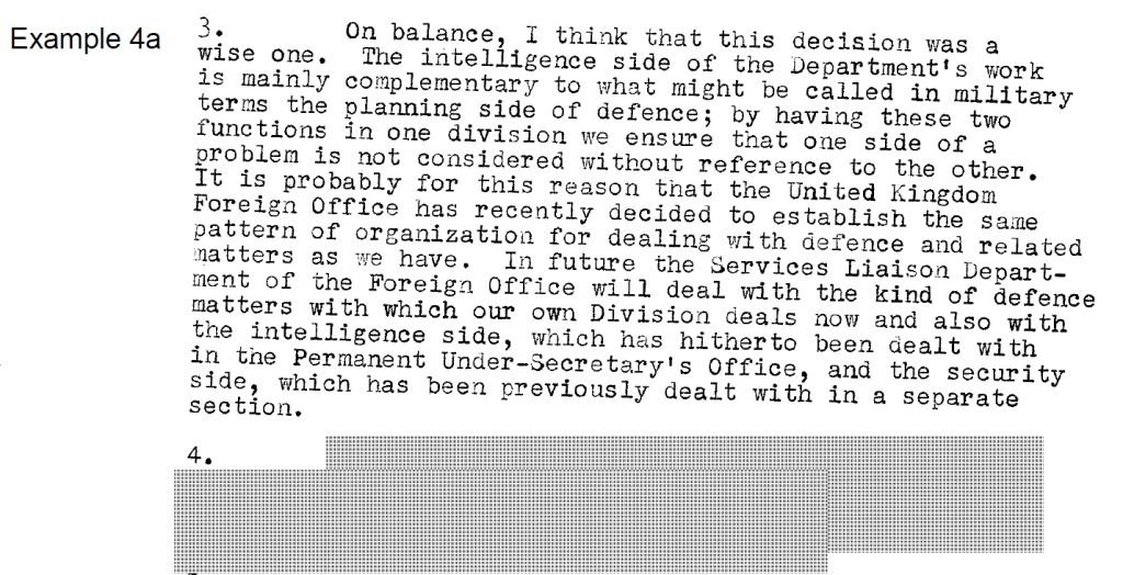 In Example 4a the department redacted a comment on the “minor advantage” of the title of the new division in providing “’cover’ for the more secret security and intelligence work,” citing Section 15(1) – Security. It is difficult to see how this redaction protected any truly sensitive security information.