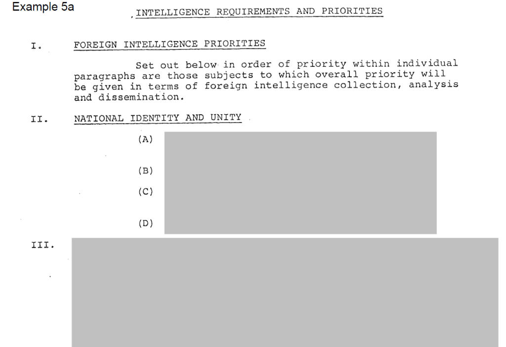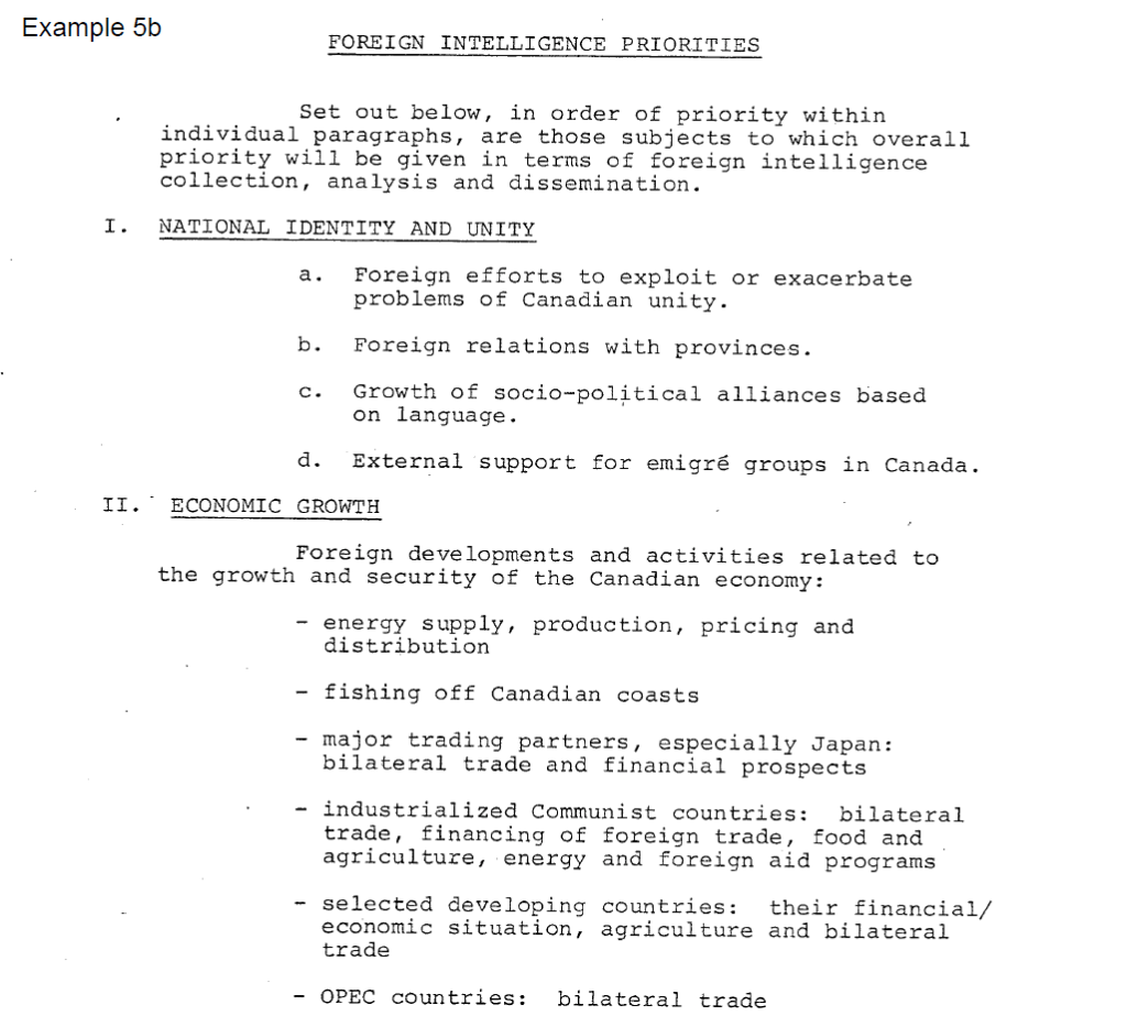 This example demonstrates the redaction of details of intelligence priorities related to national unity and economic interests. These are not surprising, and after 40 years can no longer be considered sensitive. This information was released without redaction in the second version without harm to Canadian interests.