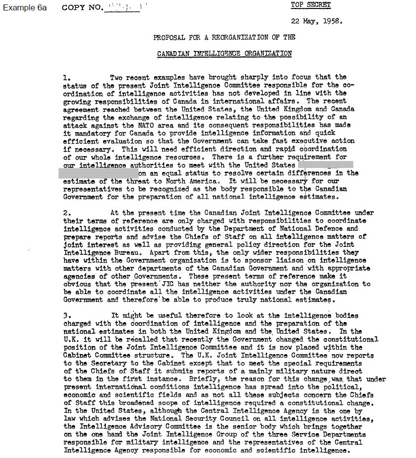 Example 6 – Extract from JIC Paper, “Proposal for a Reorganization of the Canadian Intelligence Organization,” 22 May 1958